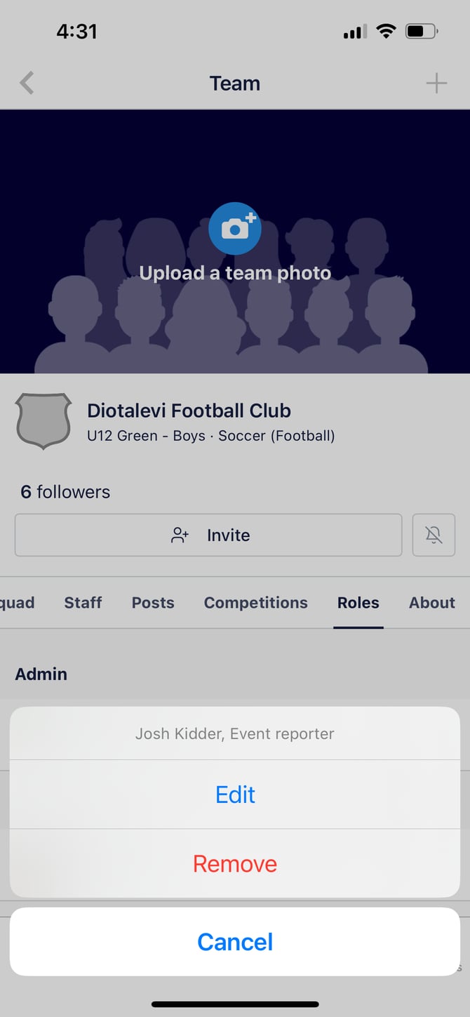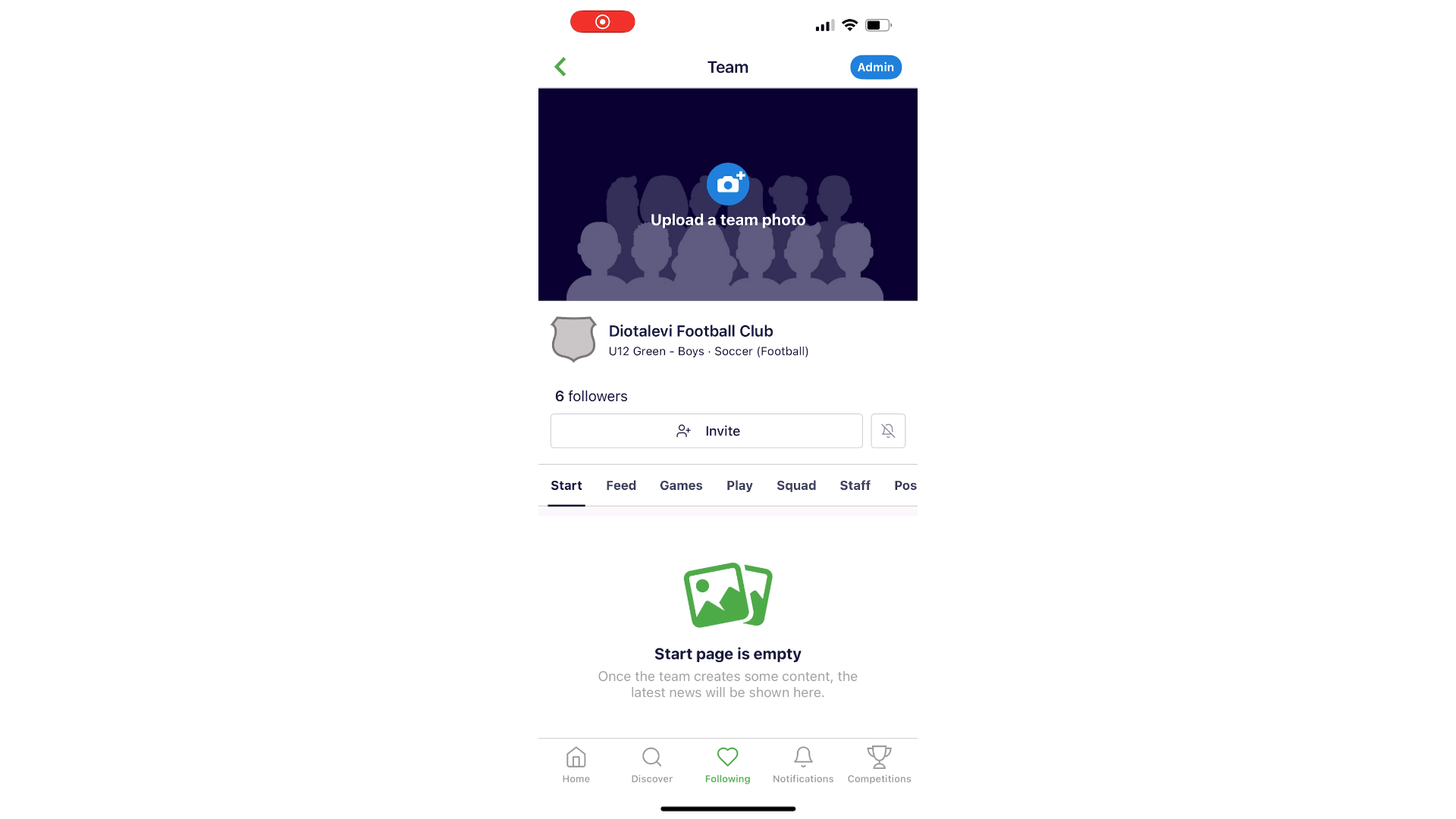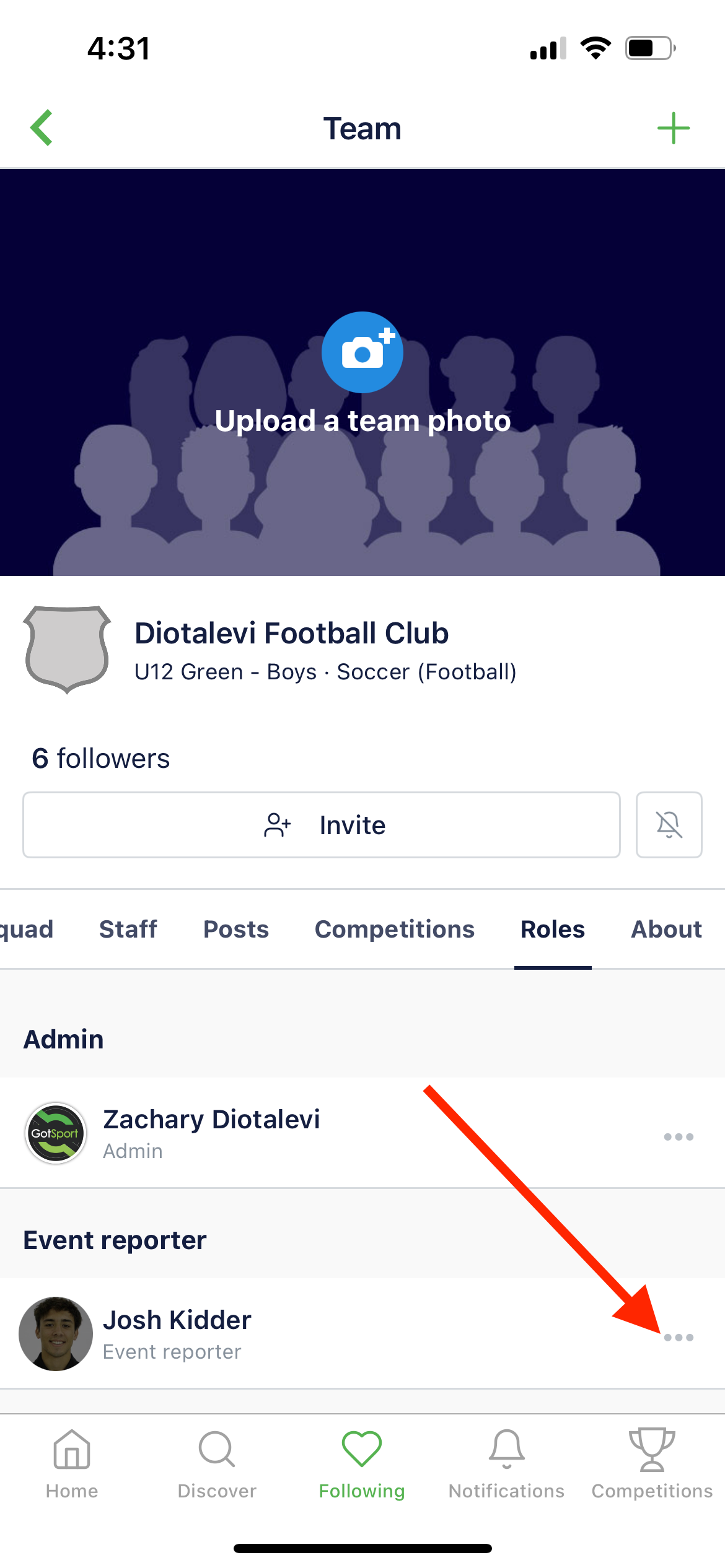 - If you follow or have a role on the team, navigate to the team's page via the Following tab in the main menu. Otherwise, click on the Team tab on the club's page (can be searched for in the Discover tab).