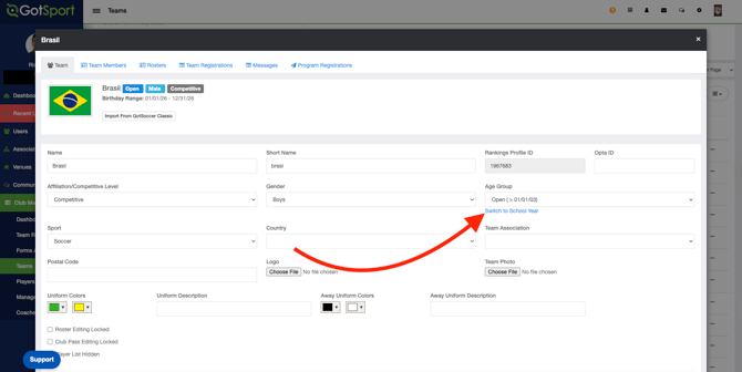 If the option displays “Change to School Year,” the team is currently set to Calendar Year. If the option displays “Change to Calendar Year,” the team is currently set to School Year.