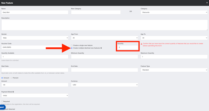 To create multiple features in bulk, select "Create multiple identical new features", enter the desired number under "Quantity" and click Save.