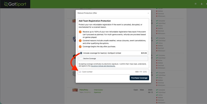 - After selecting "Include Coverage for Team(s)", you can submit the payment and click "Purchase Coverage".