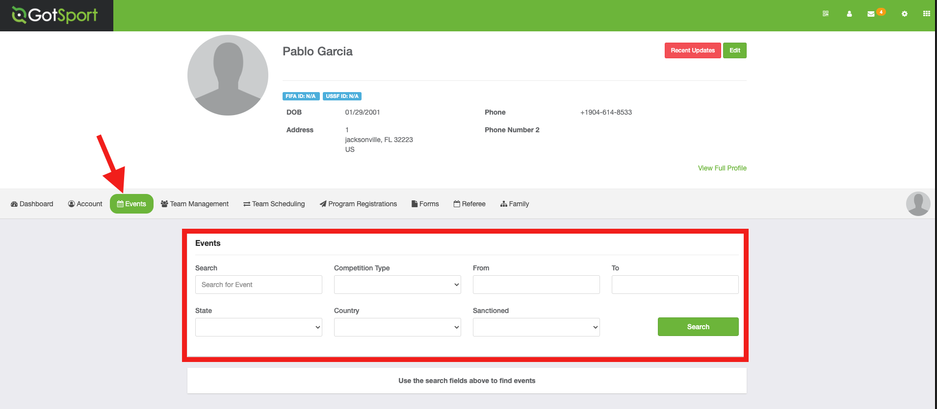 - Log into your coach/manager account and then go to the "Events" tab, here you will be able to search for events by using the filters provided.