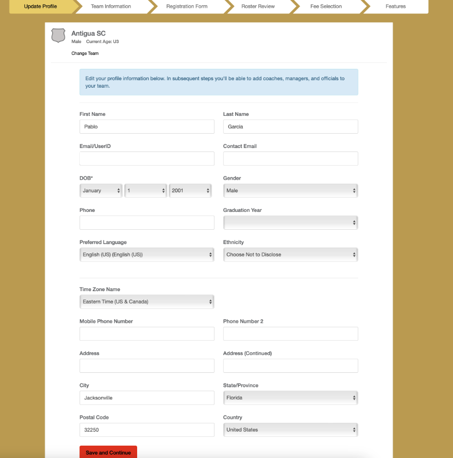 - The following tab is the Team Information Tab. Fill out the info required and select "Save and Continue".