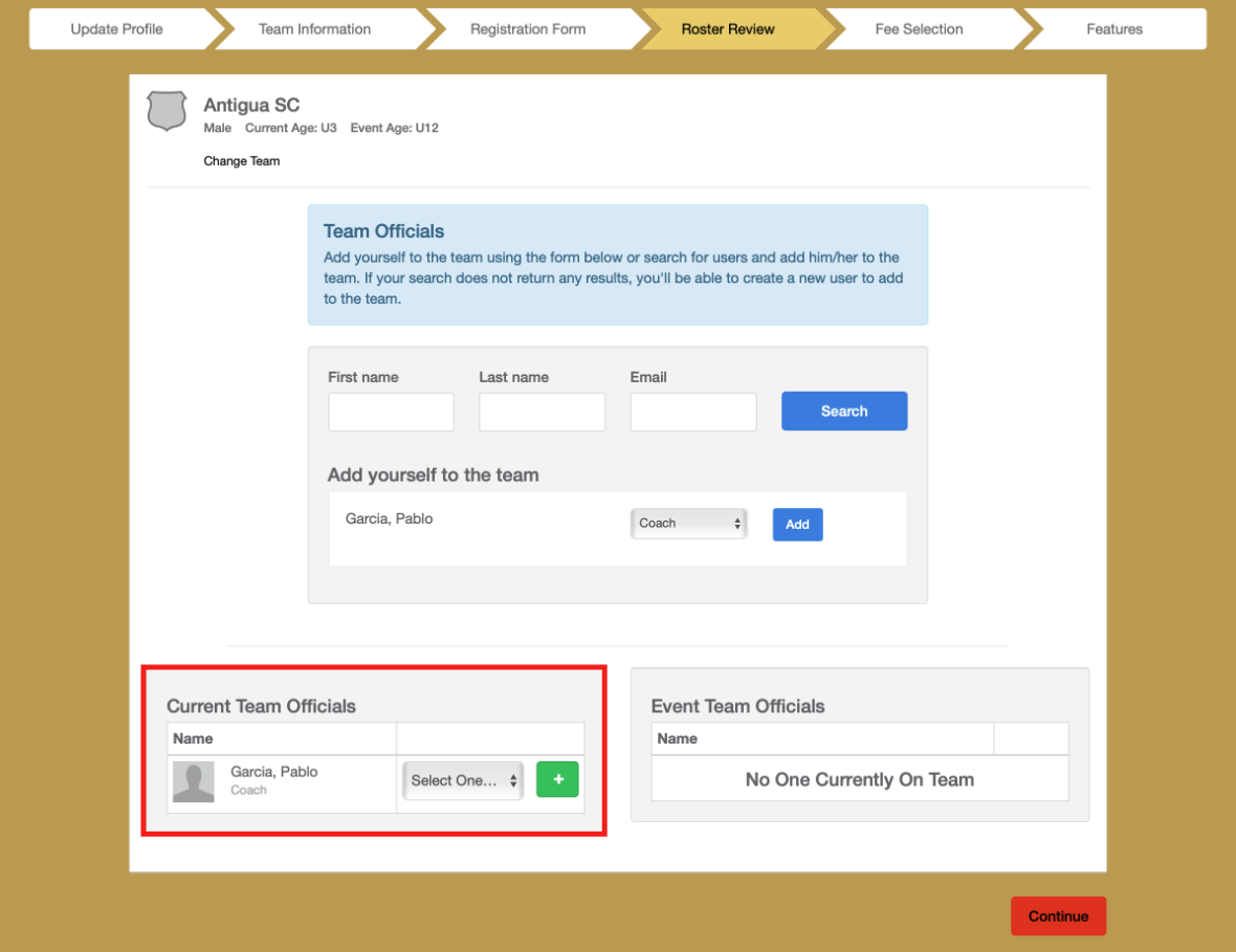 - Fill out the information regarding Roster Review. Click the green "+" button, to add team officials to the event roster, then click "Continue".