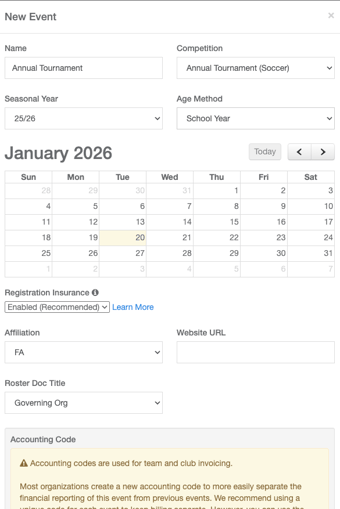Starting August 1st, any event should be set up using Age Method: School Year to be in compliance with US Soccer updates.