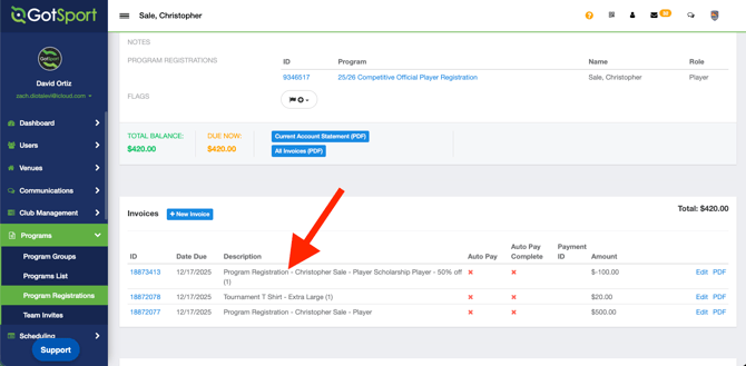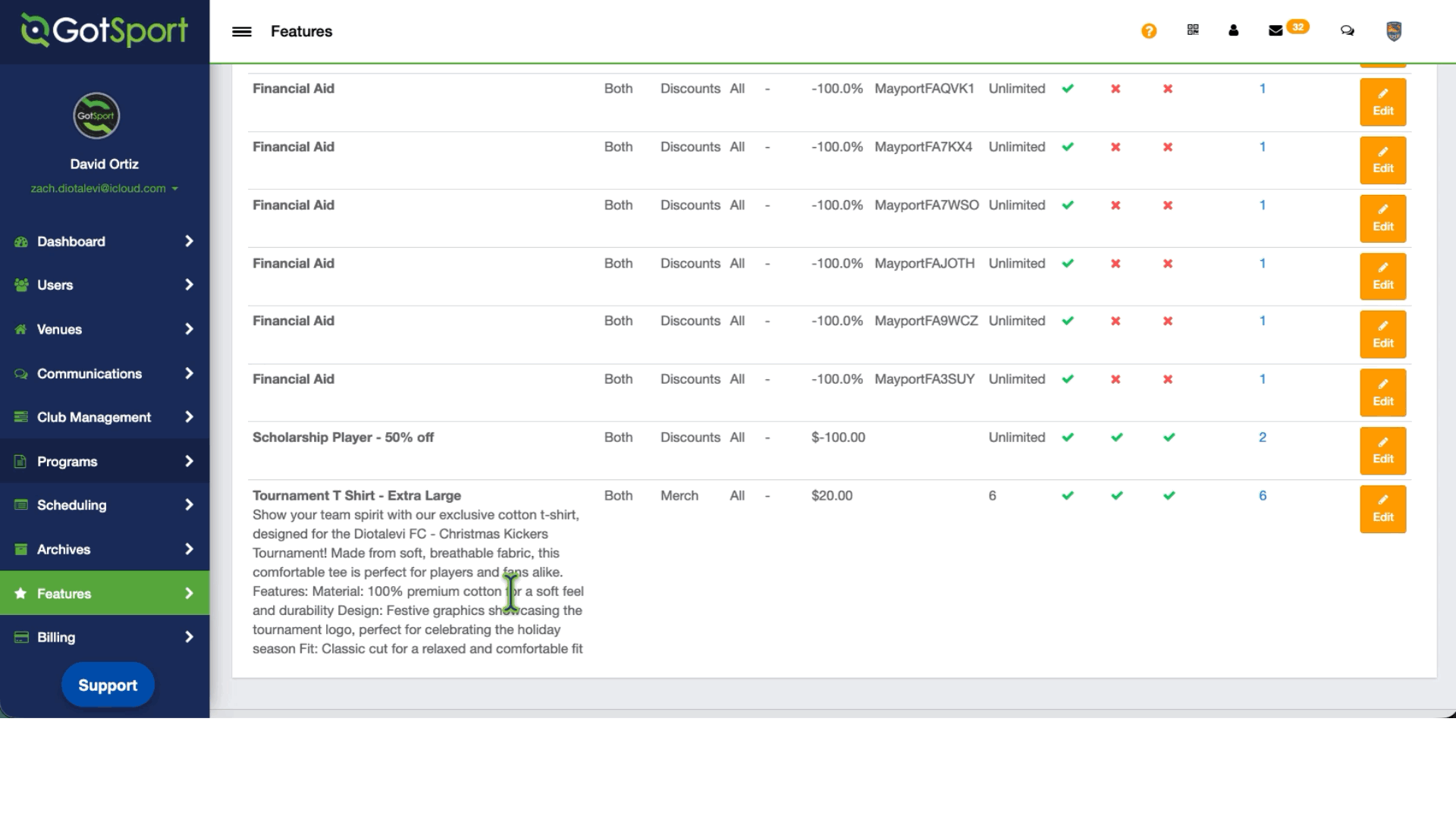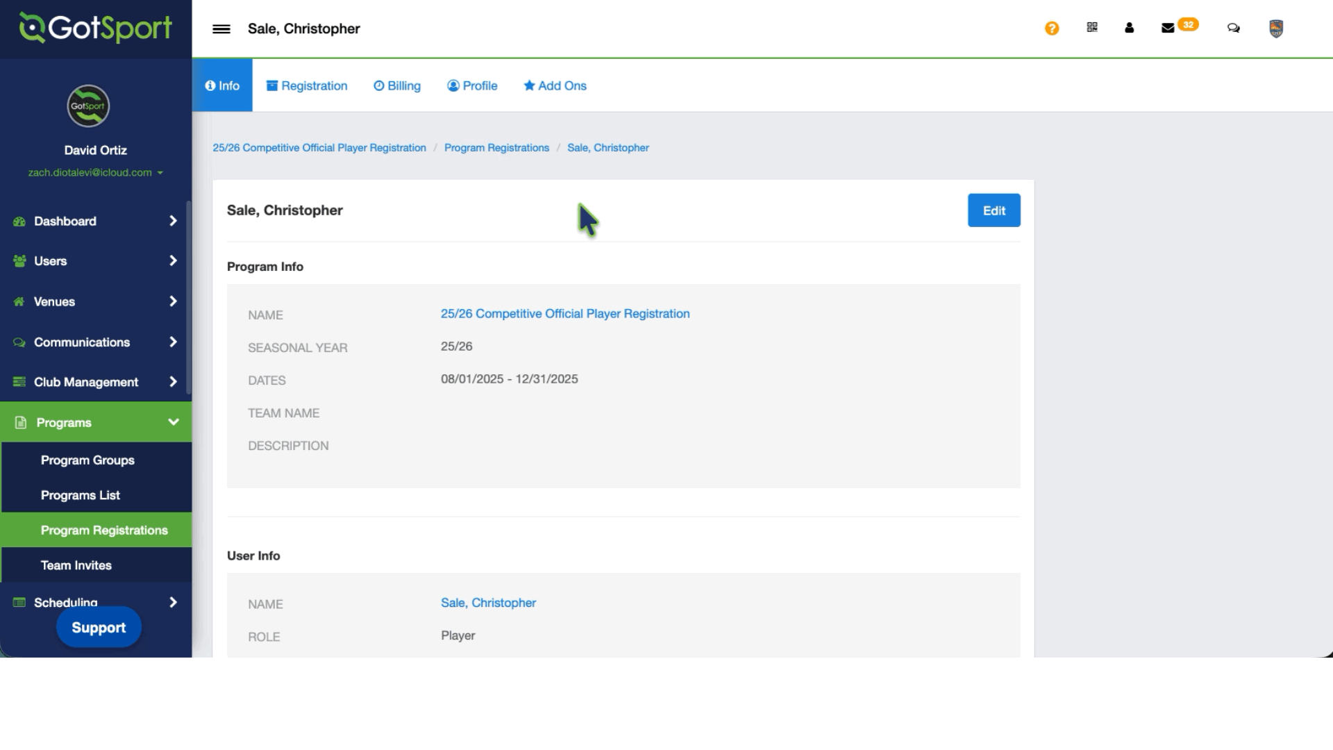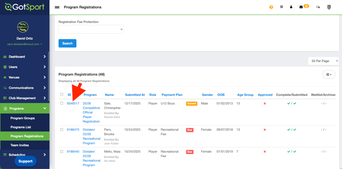 - From Programs > Program Registrations, locate the registration you want to add the feature to