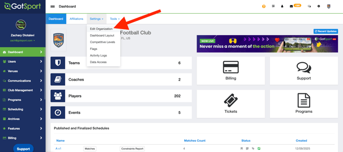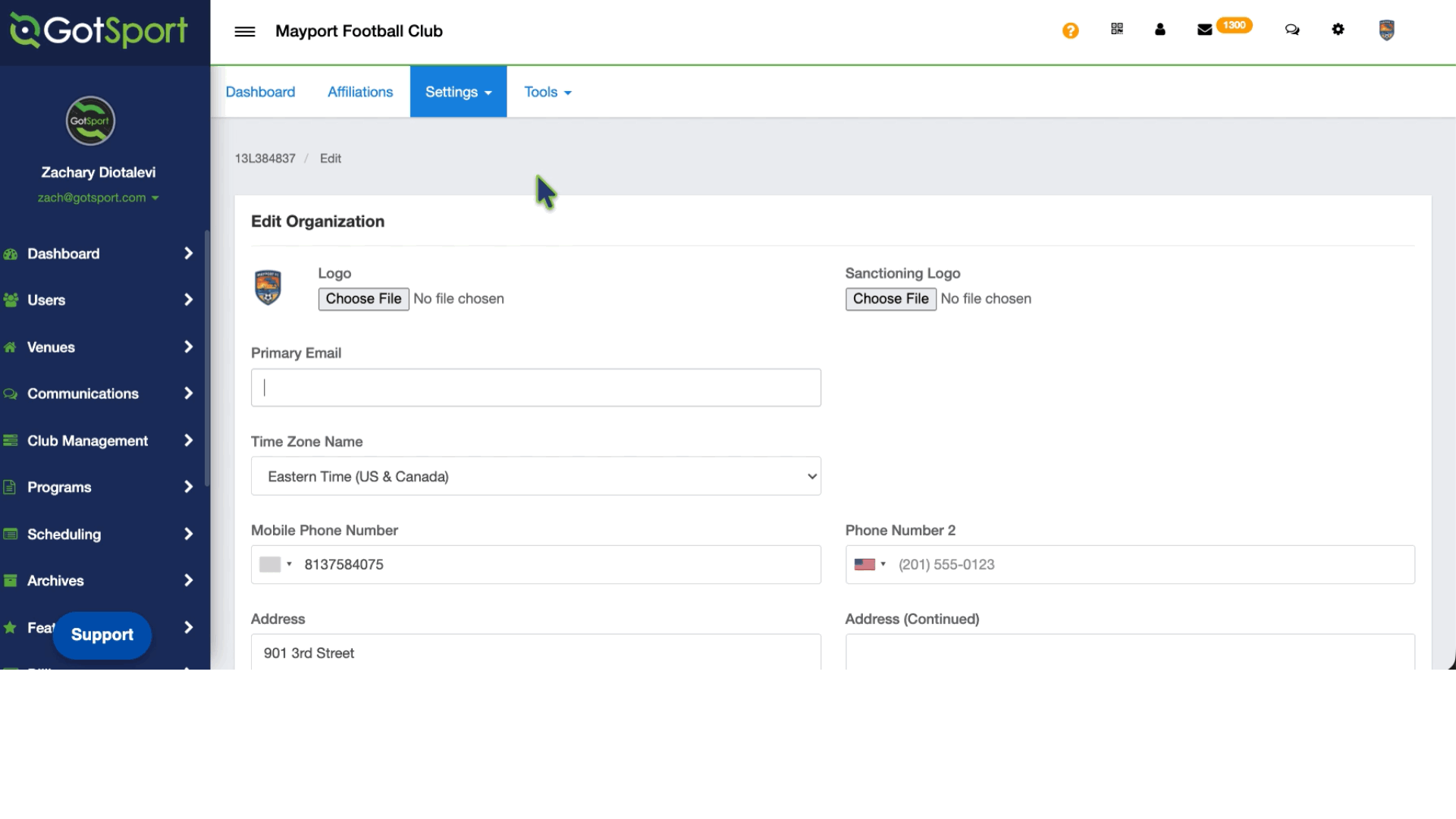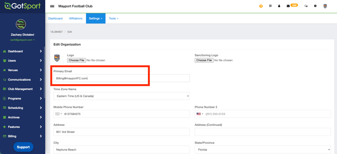The below will demonstrate the steps an Admin can take to insert or update their clubs "Primary Email". This is the email address that will appear on failed billing payments and upcoming reminders.