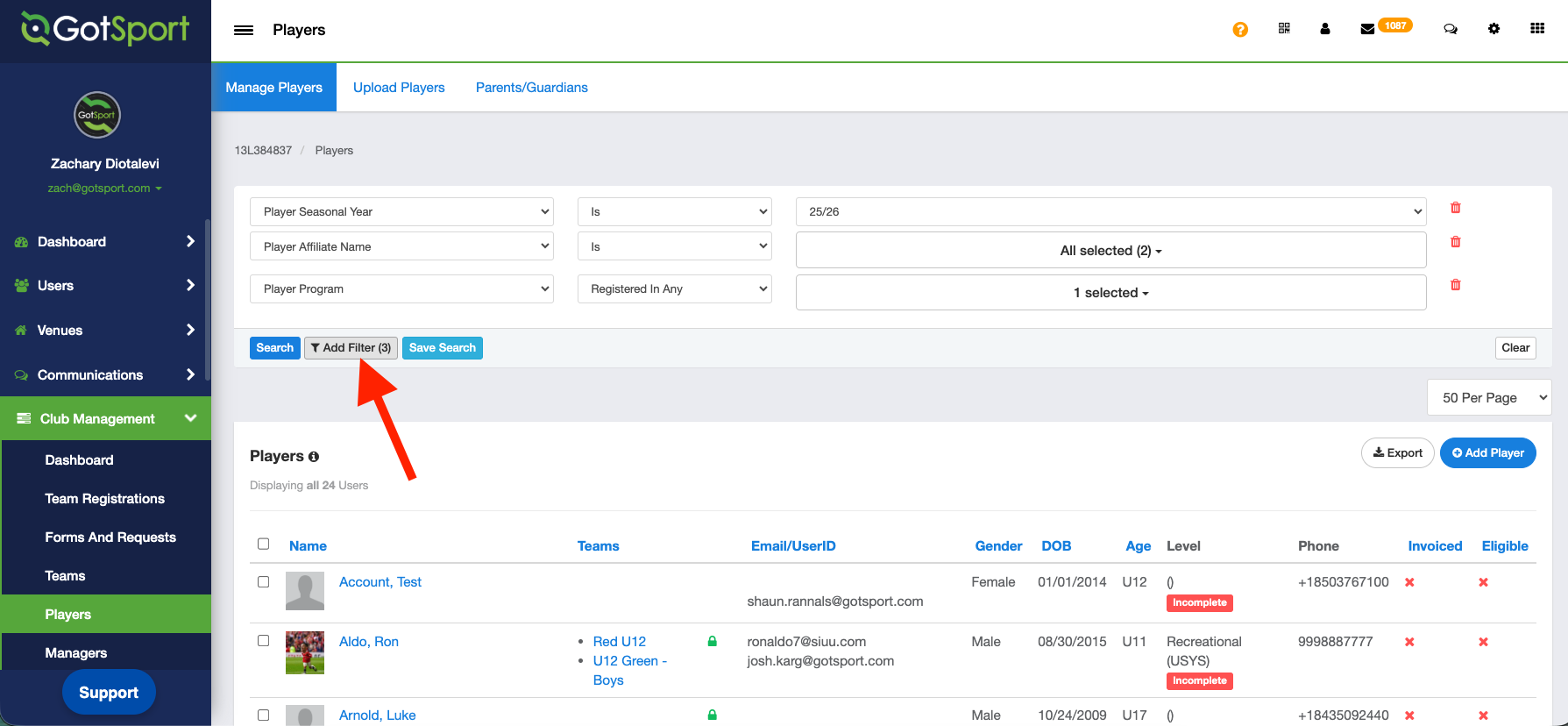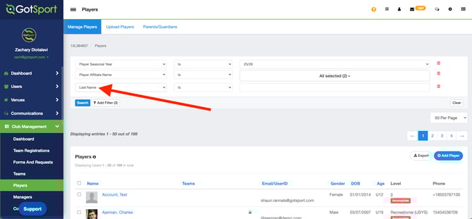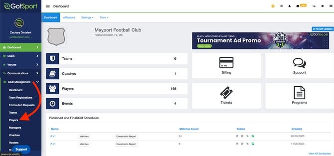 - From your Admin Dashboard, click Club Management > Players
