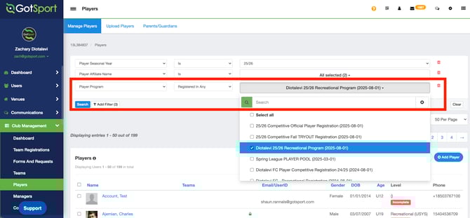 - After clicking Search, the results shown below will be those of players that have the registration flag you've selected within their Program Registration