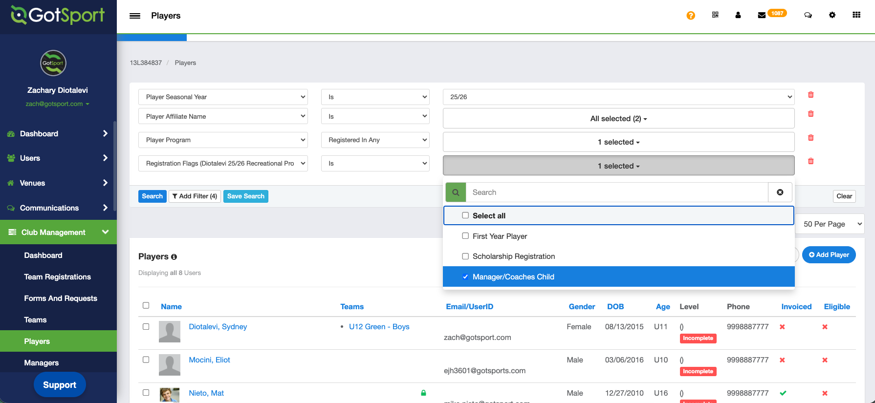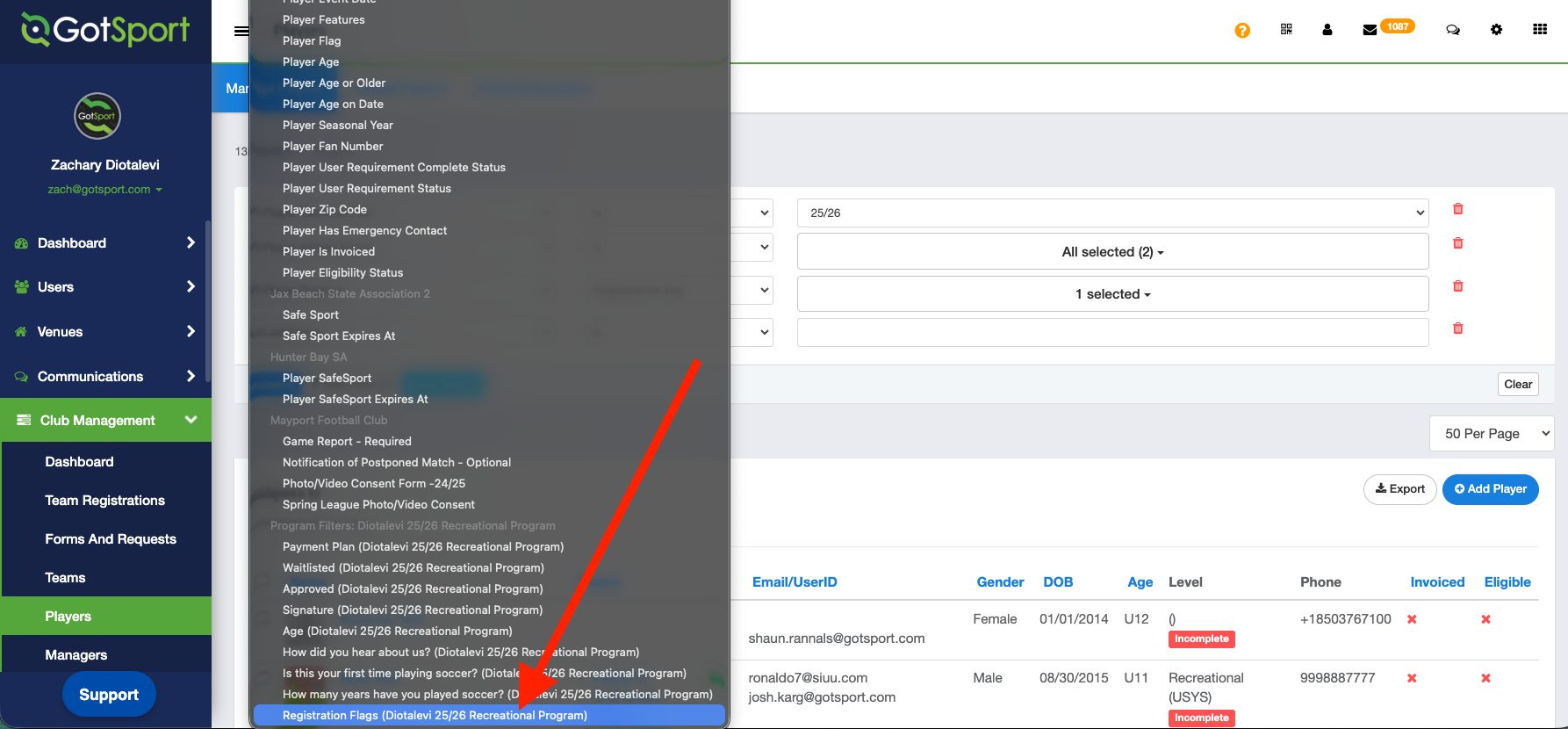 NOTE*** This is a fantastic feature within GotSport that allows the admin to filter not just by Registration Flags, but by Form Questions that were asked in programs, payment plans, and MORE! Check out this guide: As a Club Admin - Filter and Export Player Questions From Registration Form