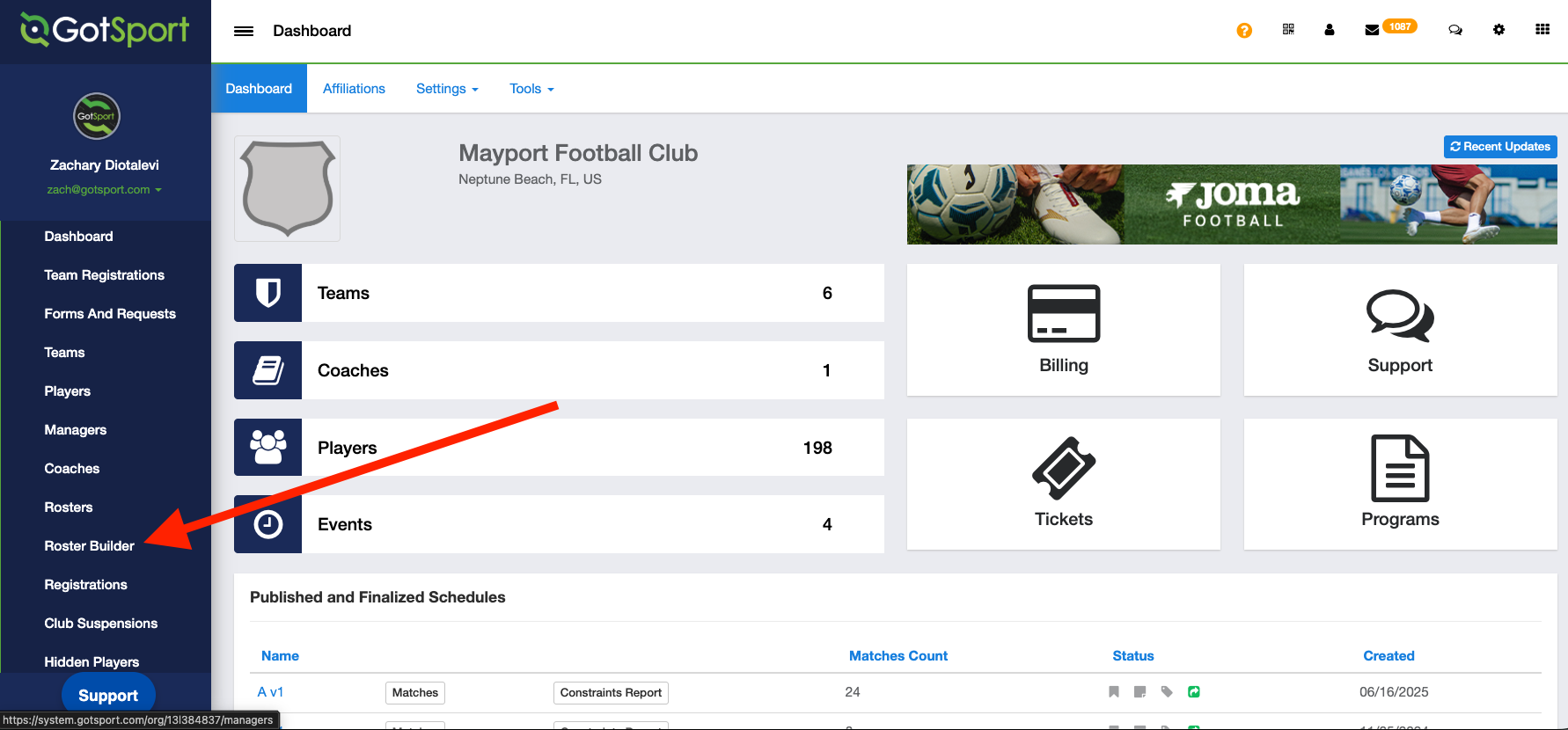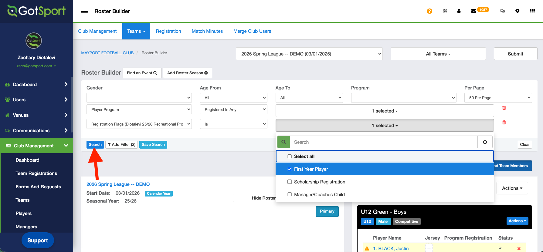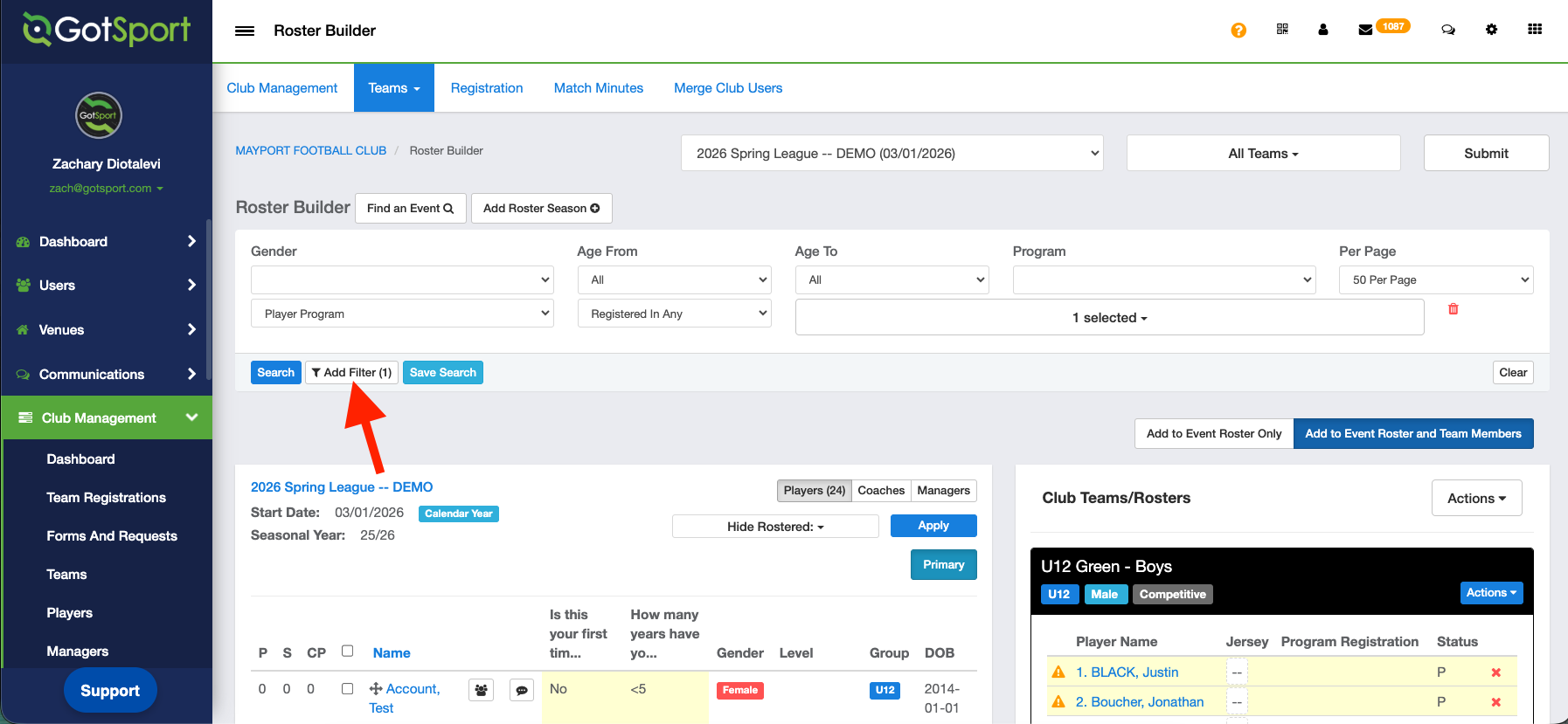 - From your Club Dashboard, click Club Management > Roster Builder