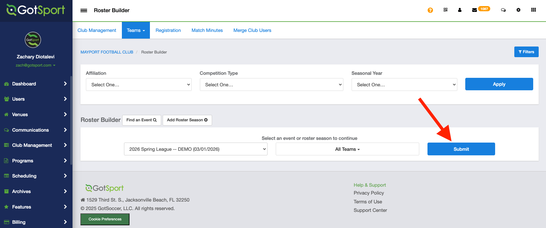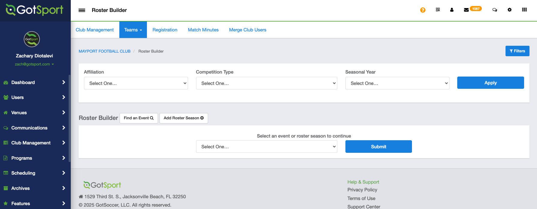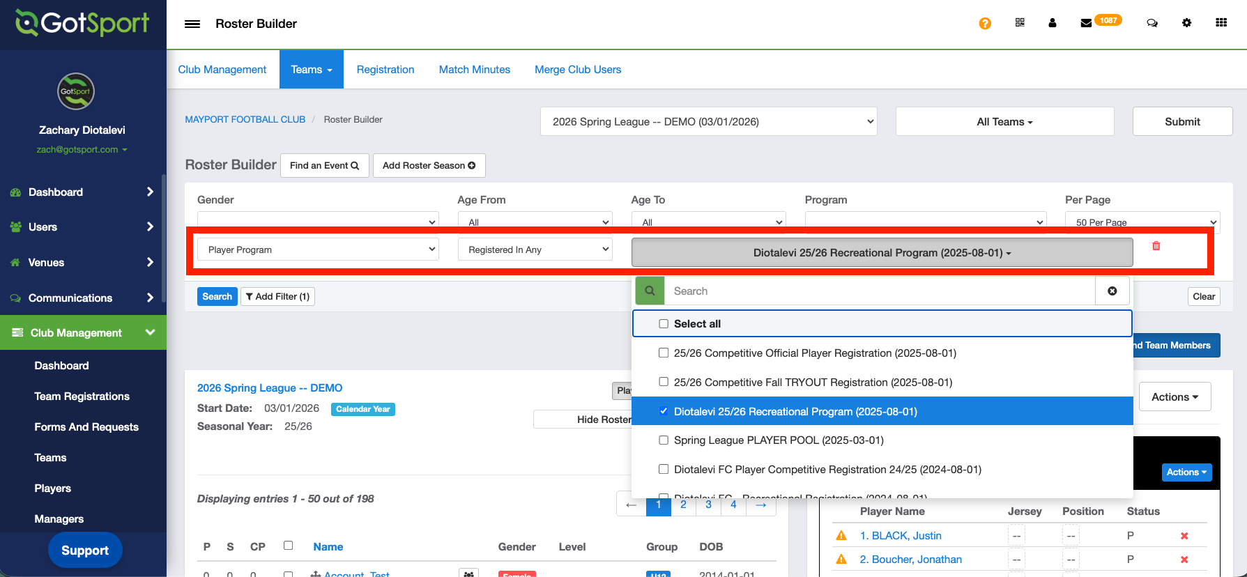 - From your Club Dashboard, click Club Management > Roster Builder