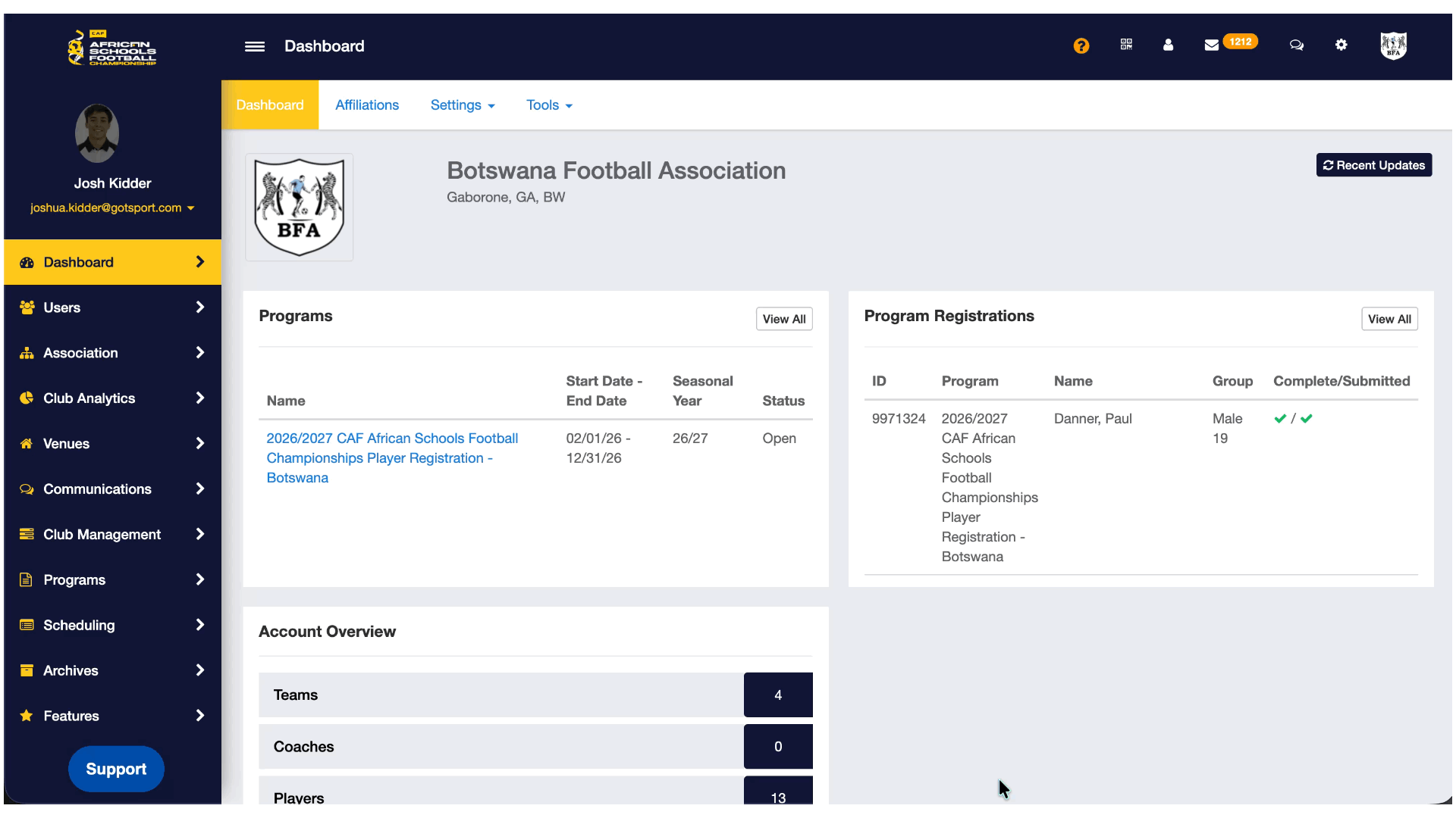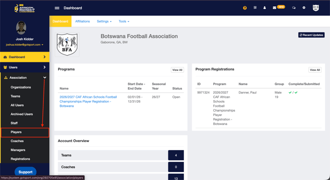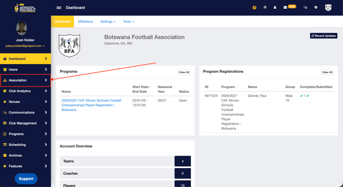 - From your Dashboard, Click Association > Players