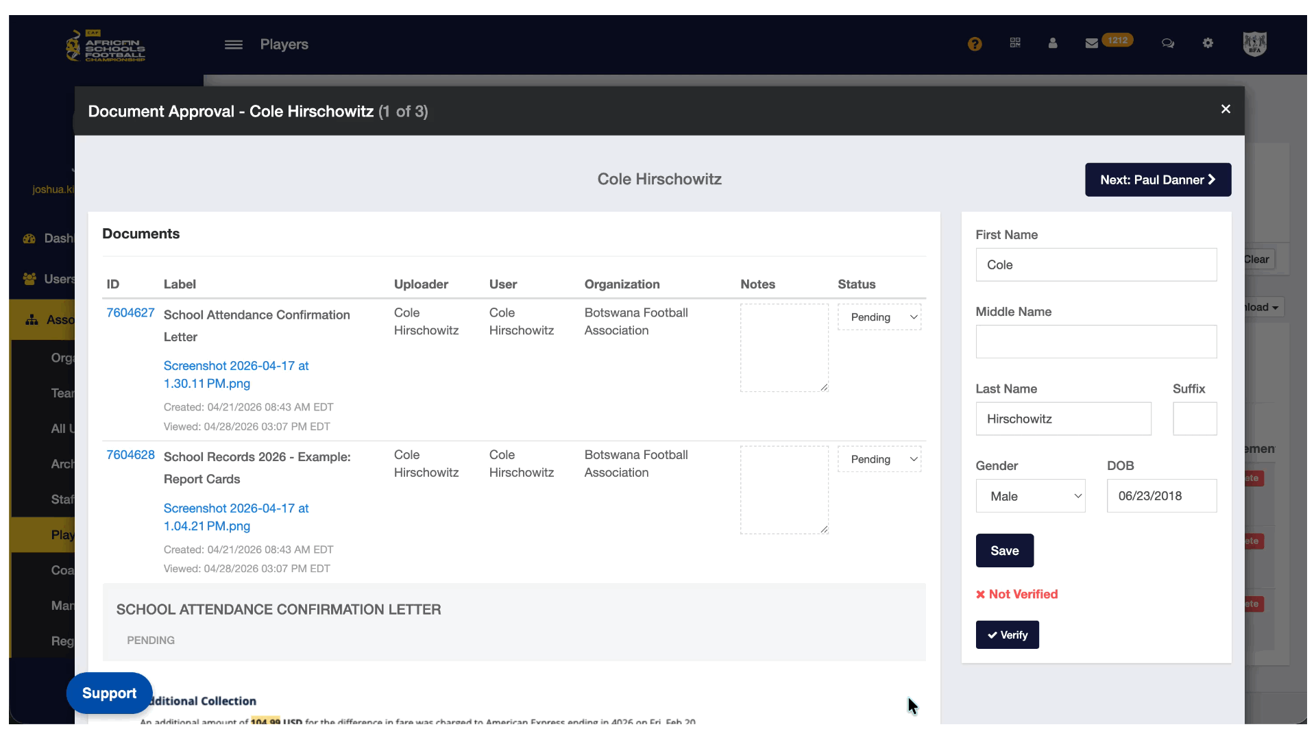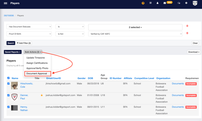 - This will give you a list of players that need their profile and documents verified