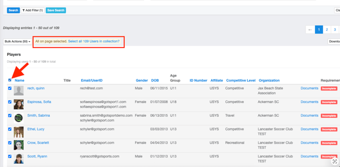 - If you're selecting ALL players on the list, be sure to click the "Select all Users" prompt shown in the screenshot below