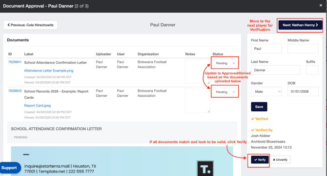 This article will walk administrators at each National Federation through how to approve, deny, and verify players.