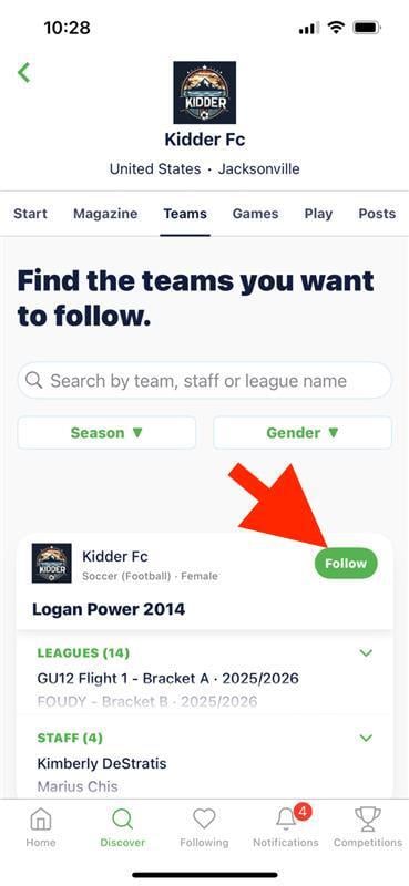 - Use the Discover tab to find your favorite team or GotSport event by name.