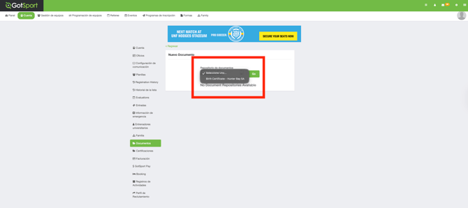 Si NO ve “Birth Certificate” como una opción, significa que su organización no ha creado un repositorio de documentos para actas de nacimiento; por favor, comuníquese con ellos y solicite que creen uno.