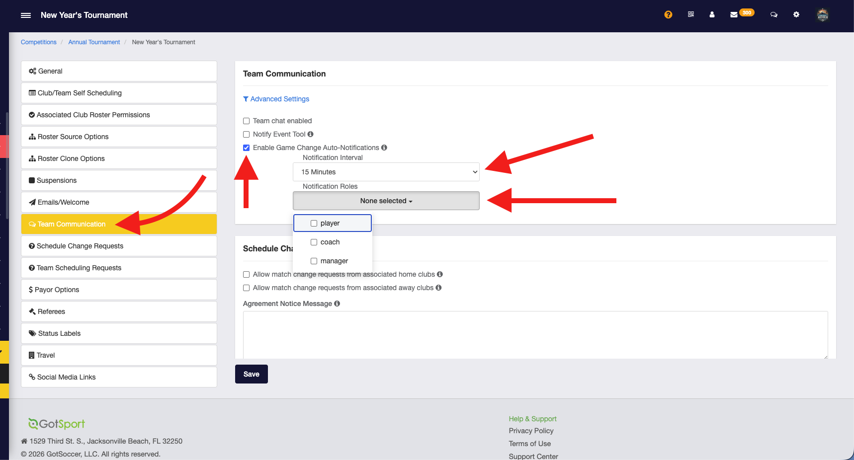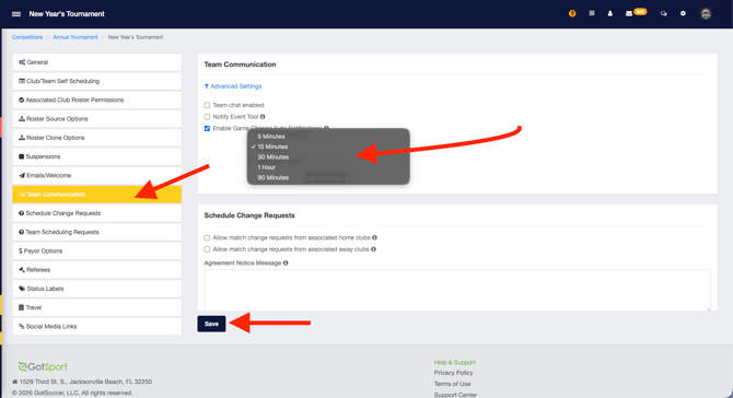 From within your event, click on the Access & Options tab. Next you'll click on Team Communications. Find the Enable Game Change Auto-Notifications setting and turn on.