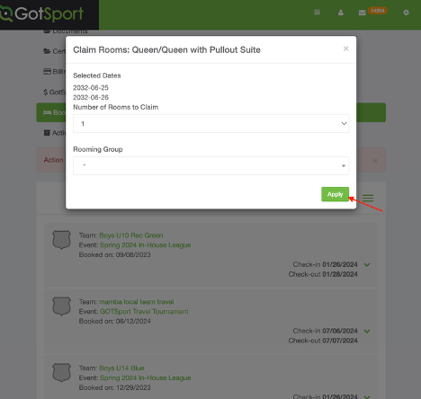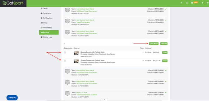 Seleccione las cajas del lado izquierdo de cada noche que necesite para su reserva y, a continuación, haga clic en "Claim Room"