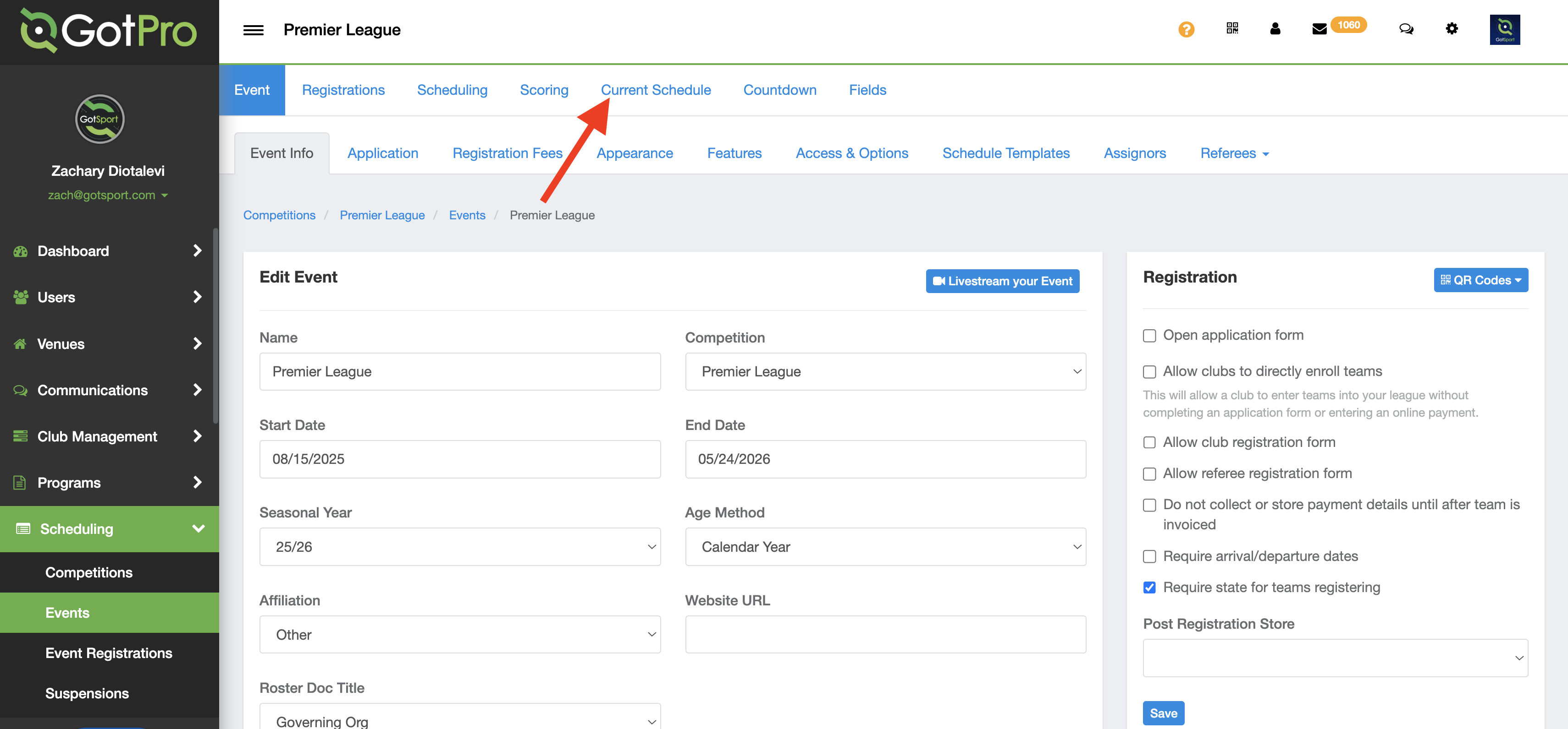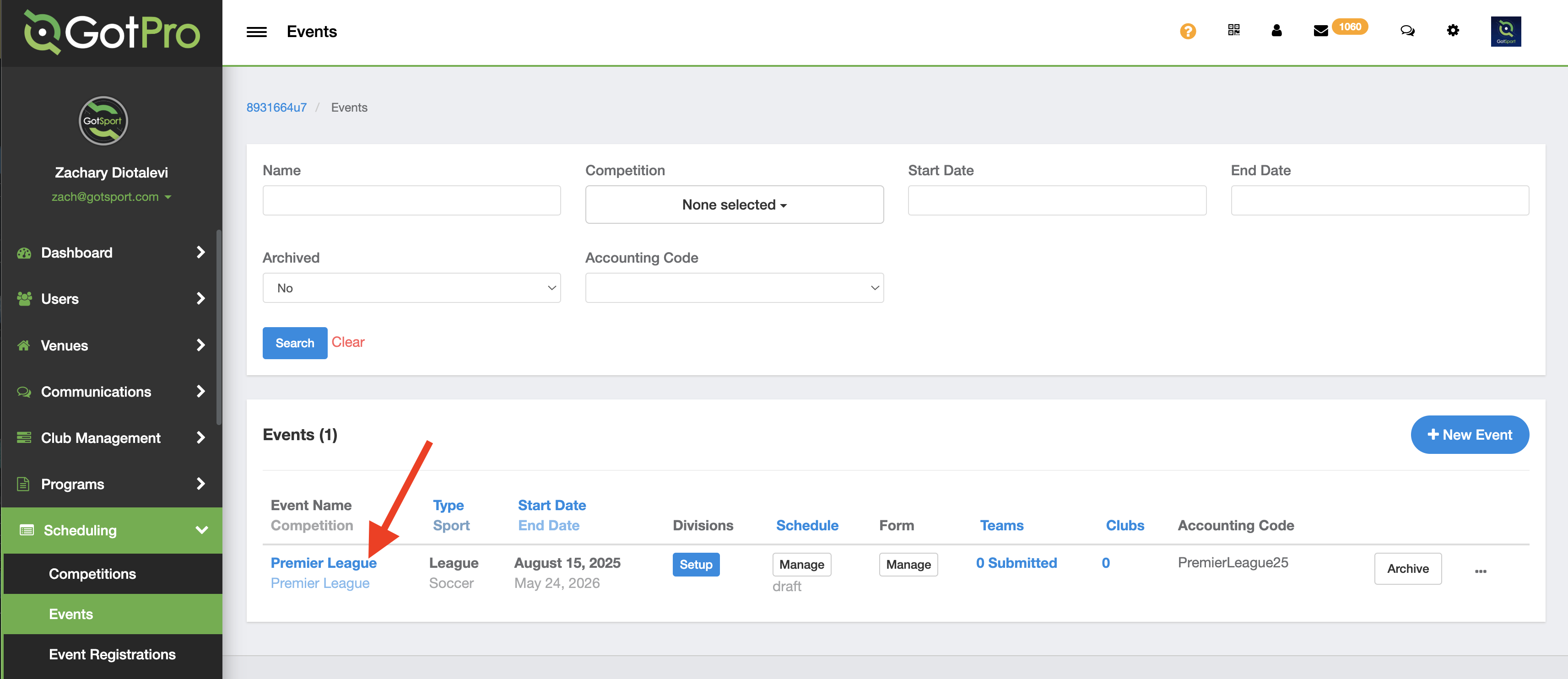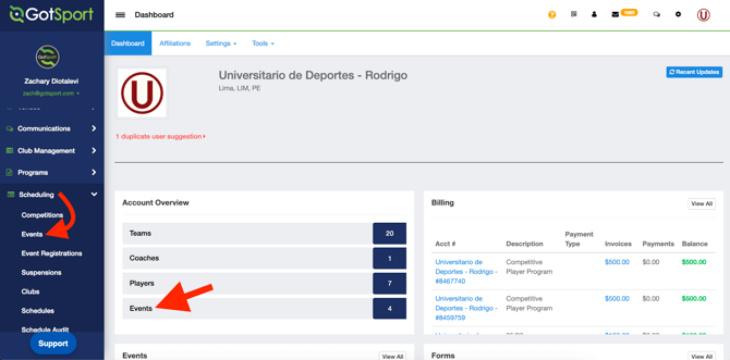 - From your Organization Dashboard, click Scheduling > Events or onto the Events module