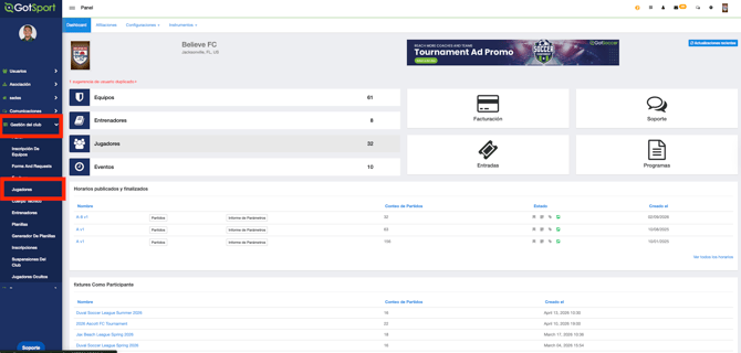 Desde tu Panel de control, haz clic en Gestión Del Club (Club Management) y luego en Jugadores (Players).