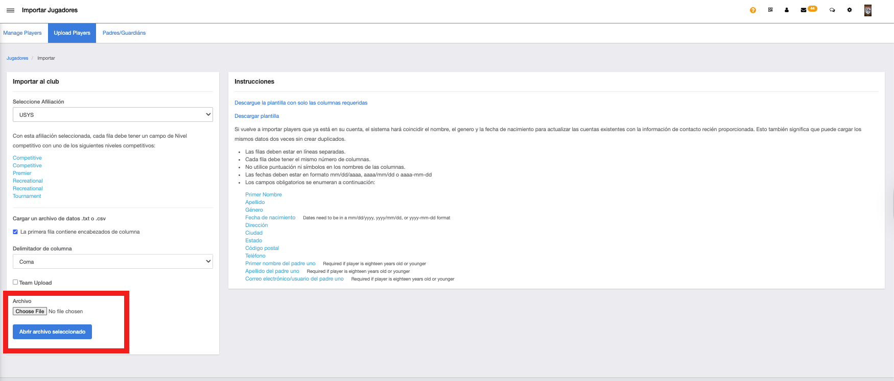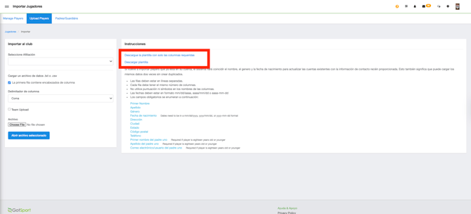Una vez dentro de la página de Importar Jugadores, completa la información requerida para subir el documento.