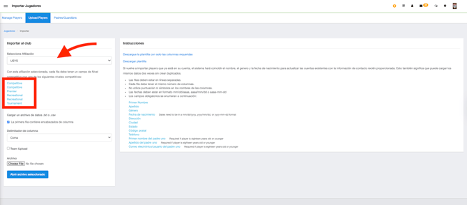 Será obligatorio incluir el Nivel Competitivo de cada jugador (la lista de Niveles Competitivos disponibles se mostrará una vez que se seleccione la Afiliación para incluirla en el archivo).