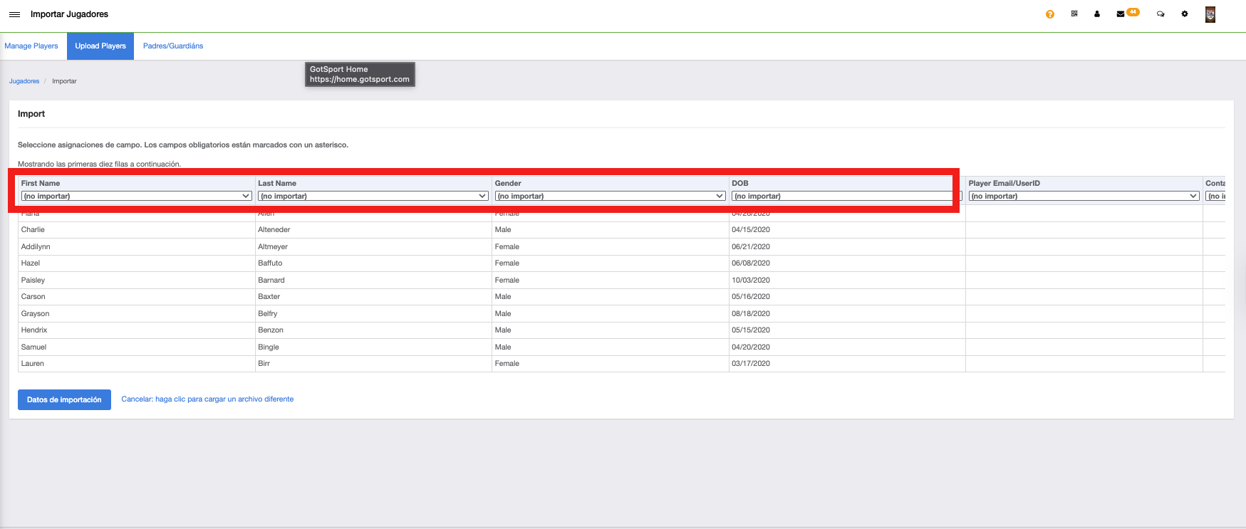 Desde aquí, deberás coincidir los encabezados de las columnas de tu archivo de carga de jugadores y luego hacer clic en “Importar datos”