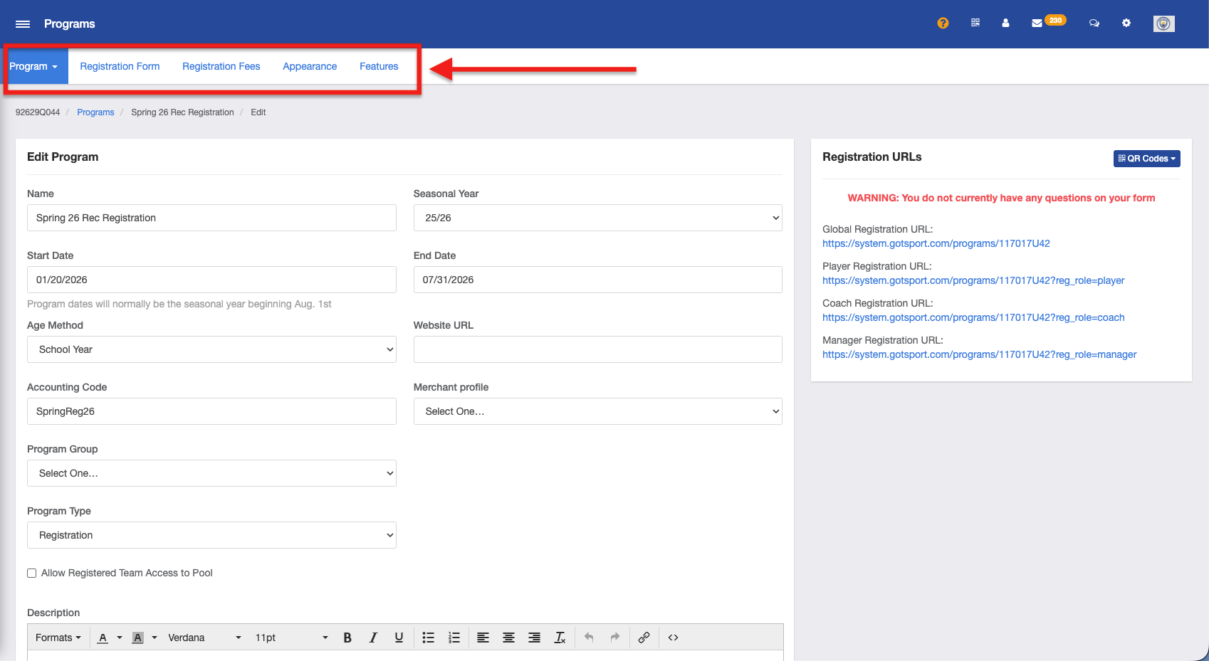 - After clicking Save, five new tabs will appear at the top of your page including Programs (when clicked on you will see Program List and Program Registrations), Registration Form, Registration Fees, Appearance, and Features.
