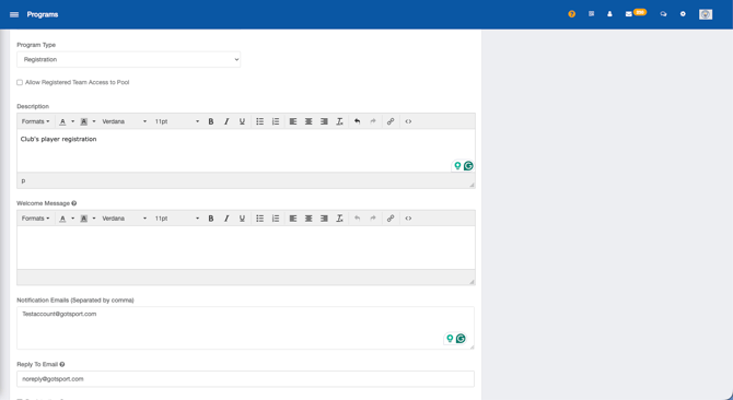 - Notification Emails: Any email address placed here will receive an email notification when a player registers for the program.