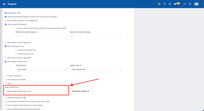 - Team Invite Event:(Best used if you have a tryout registration) If you are sending team invites, select your club's internal rostering event you would have created while setting up your tryout registration (ex. Internal Roster 23/24). Once players register from the invites you send, they will be automatically rostered to the team within the internal rostering event upon completion of the registration.