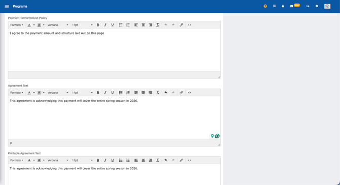 - Payment Terms/Refund Policy: Standard payment terms will be present by default, however, you may overwrite the standard text and enter your club's own payment terms if needed.