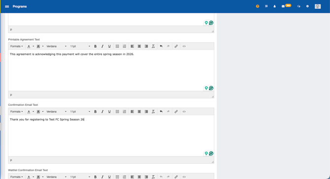 - Waitlist Confirmation Email Text: This is the text that will be sent to the registrant when the available spots are filled and the user is placed on a waitlist.